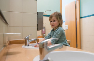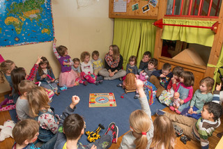 Der Krippenraum ist nur durch ein kleines Tor vom Kindergartenbereich abgetrennt und ist für die Kleinen gut als Krabbel- und Erlebniswelt geeignet. Die gummierte Terrasse ist direkt durch den Gruppenraum zu erreichen und bietet den Kindern einen abgegrenzten Außenbereich.