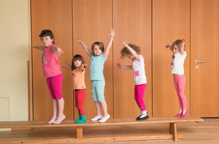 Unseren Turn- und Funktionsraum nutzen wir täglich für Bewegungsstunden, als Schlafsaal und auch als freie Bewegungsbaustelle.