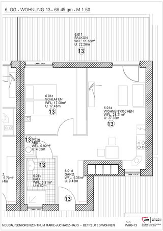 Die Wohnungen bestehen aus Vorraum, Kochzeile, ggf. Einbauschrank, Bad mit (Sitz-)Dusche, Wohn- und Schlafzimmer mit elektrischen Jalousien sowie Balkon bzw. Wintergarten. Zu jeder Wohnung gehört ebenfalls ein Kellerabteil.