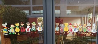 Die Mittagsbetreuung befindet sich in einem Modulbau hinter der Schulturnhalle, vom Lehrerparkplatz aus rechts die Treppe hoch. Dort an der Turnhalle hängt auch unser Briefkasten.