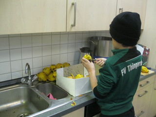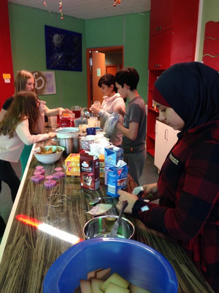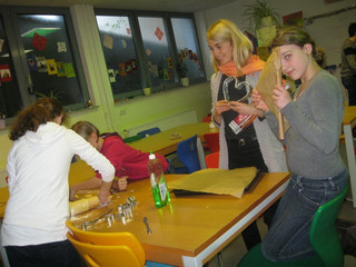 Da die OGS mit einer kompletten Küchenzeile ausgestattet ist, nutzen wir diese oft für verschiedenste Kochaktionen und bereiten einfache aber tolle Gerichte wie Pfannkuchen, Holunderküchle, selbstgemachte Pizza, Kuchen oder Muffins zu.