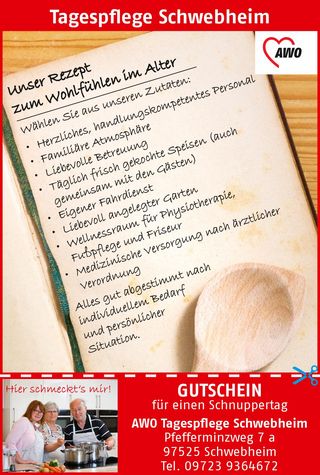 Unsere Tagespflege nahe Schweinfurt wurde auf dem Gelände des AWO Seniorenzentrums Schwebheim neu errichtet und ist für unsere Gäste tagsüber ein Wohlfühlort mit vielen Annehmlichkeiten: Ganztägige Betreuung, medizinische Versorgung und abwechslungsreiche Aktivitäten – das und vieles mehr bieten wir Senior*innen, die den Tag in angenehmer Gesellschaft verbringen möchten. Gleichzeitig erfahren pflegende Angehörige durch unser Angebot die Entlastung, die sie brauchen, um Kraft zu tanken, Termine wahrzunehmen und die Balance zwischen Pflege, Beruf und den eigenen Freiräumen zu wahren.