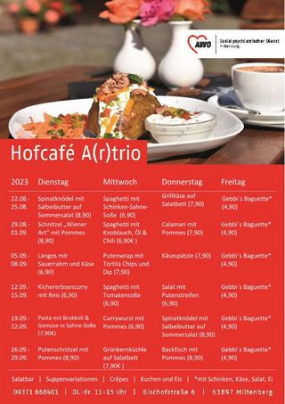 Seit 2012 betreibt das Tageszentrum der Arbeiterwohlfahrt (AWO) des Bezirksverbands Unterfranken e.V. in Miltenberg das Hofcafé „A(r)trio“ in einem inklusiven Ansatz. Mit täglich wechselndem und saisonalem Angebot werden von Dienstag bis Donnerstag liebevoll hochwertige Speisen zubereitet.