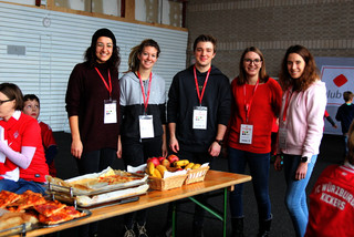 Während sich vor dem Spiel draußen auf dem Rasen die Spieler aus Würzburg und Aalen warmlaufen, sind die rund 40 Kinder in der Boxhalle schon längst auf voller Betriebstemperatur. Keine leichte Aufgabe für die fünf AWO-Betreuer Selma Acar, Alexandra Lockl, Laurenz Seubert, Eva Feineis und Lara Pröschl. „So viele wie heute waren es noch nie“, stöhnen die Fünf und passen gut auf, dass sich im Gewusel keiner verletzt und keiner verloren geht. Als sie schließlich große Bleche auf die Tische in der Halle stellen, wird es kurz ruhiger, Pizza und Limo sind erst einmal wichtiger als Fußball, Tischkicker oder Fangen zu spielen.