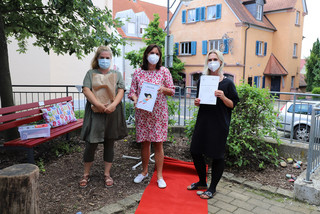 Für die erfolgreiche Umsetzung des Bundesprogramms haben Krätzer und Reuß von Fachberaterin Petra de Marche Urkunden erhalten. Zur Feier des Tages wurde sogar der rote Teppich ausgerollt. Doch nicht nur de Marche fand lobende Worte für Krätzer und Reuß, die beiden bedankten sich auch bei ihrer Fachberaterin und überreichten im Gegenzug die Urkunde für die „Super Sprachfachkraft“ an de Marche.