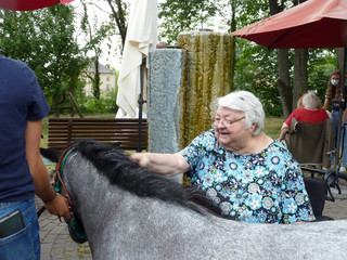 Und wie man sehen kann, waren das auch die Bewohner*innen: sie hatten sichtlich Freude mit den Ponys, die sich geduldig streicheln ließen. Und der Park des Bernhard-Junker-Hauses war wie geschaffen für diese Aktion.